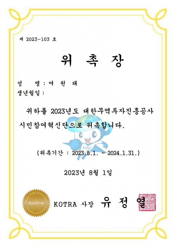 Letter of Appointment of KOTRA Citizen Participation Innovation Group 관련링크 mondereve 158 0 본문 Letter of Appointment of KOTRA Citizen Participation Innovation Group SHARE THIS PAGE 목록
